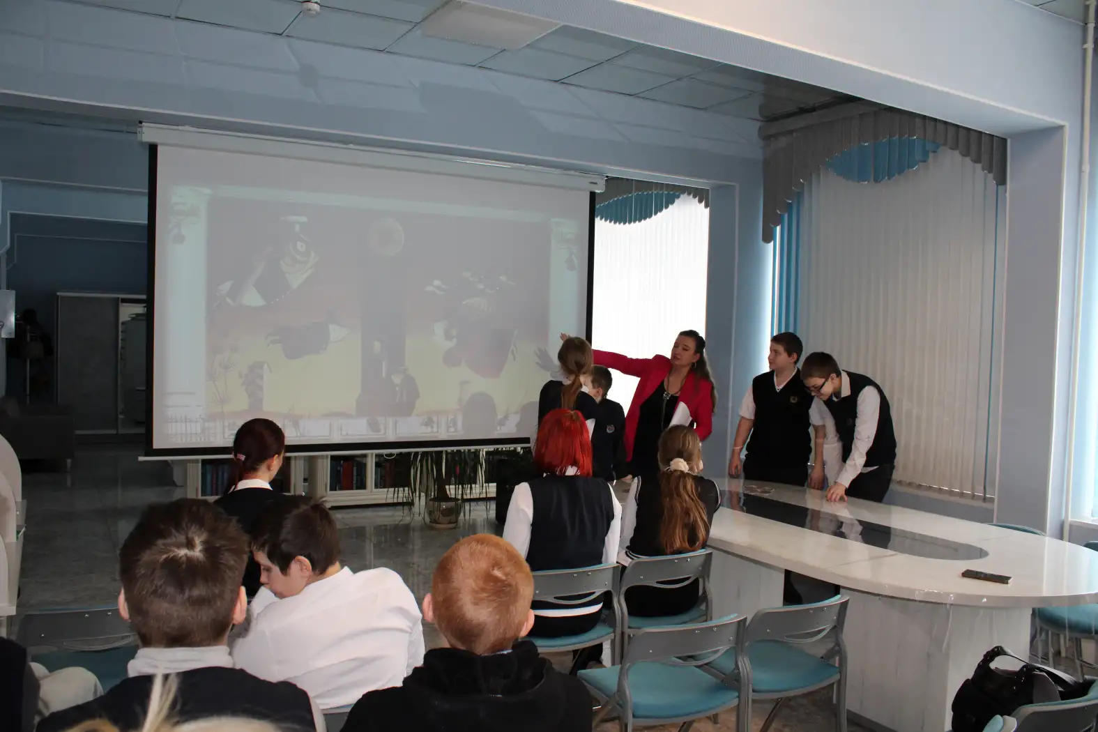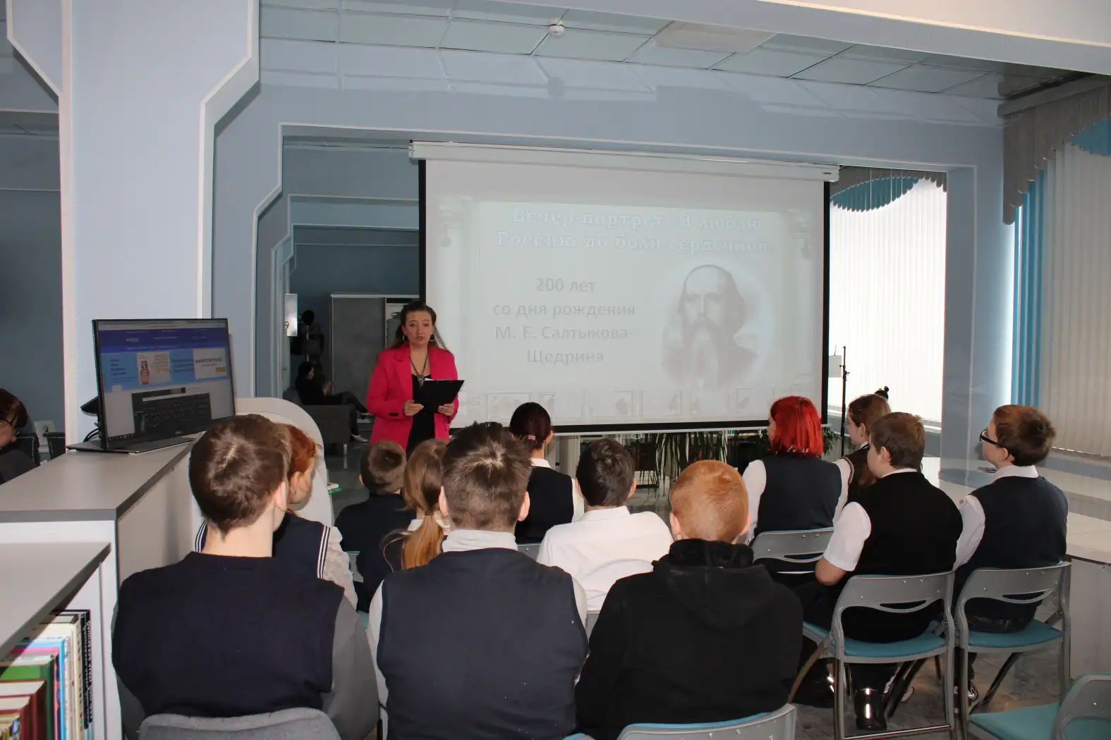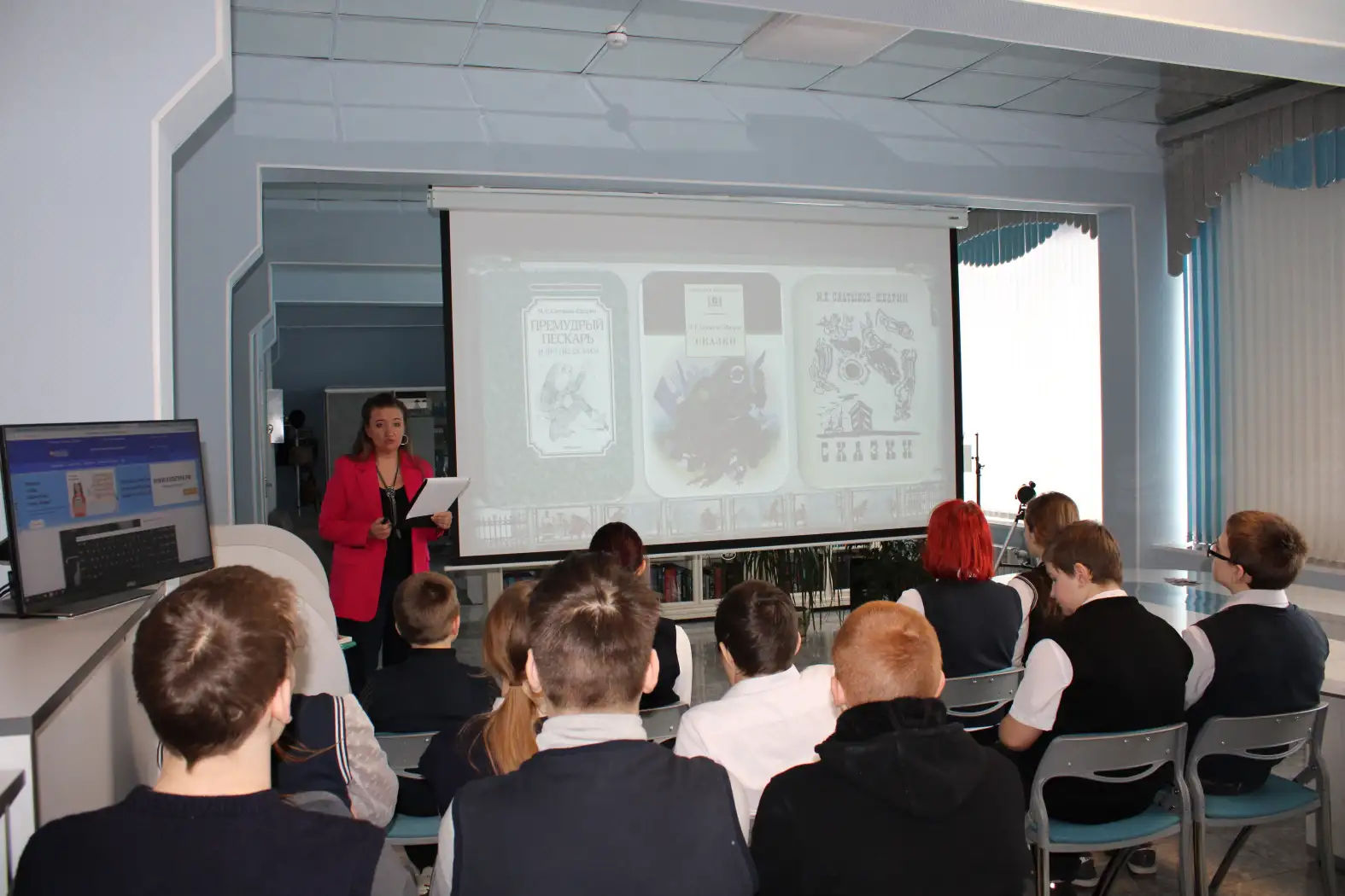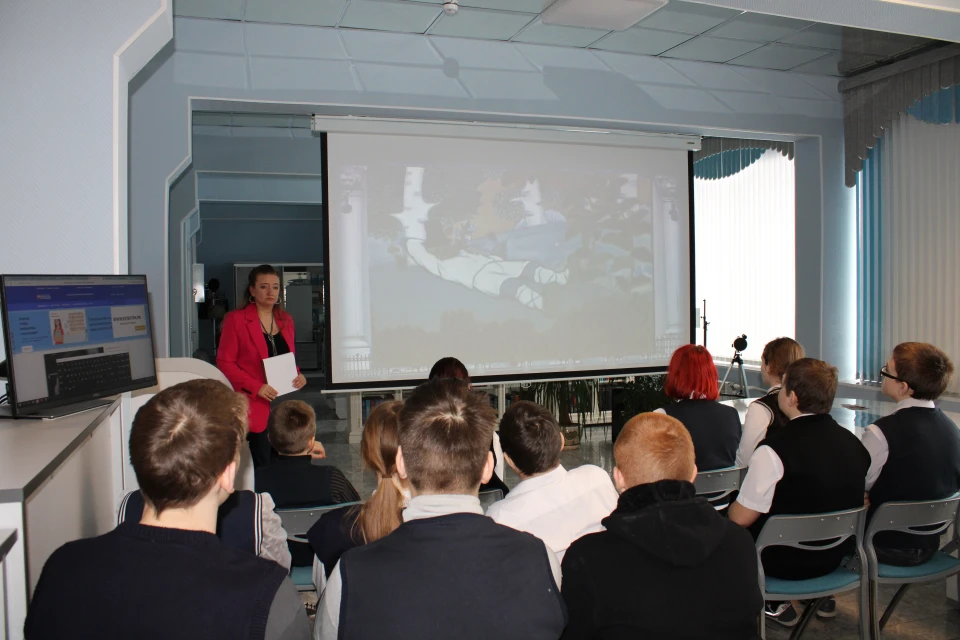 Сотрудники библиотеки рассказали семиклассникам школы №2 о жизни и творчестве писателя. Чтобы сделать встречу ещё более наглядной и увлекательной, школьникам показали видеофрагменты по мотивам знаменитых произведений Салтыкова-Щедрина – «Премудрый пескарь» и «Повесть о том, как один мужик двух генералов прокормил».