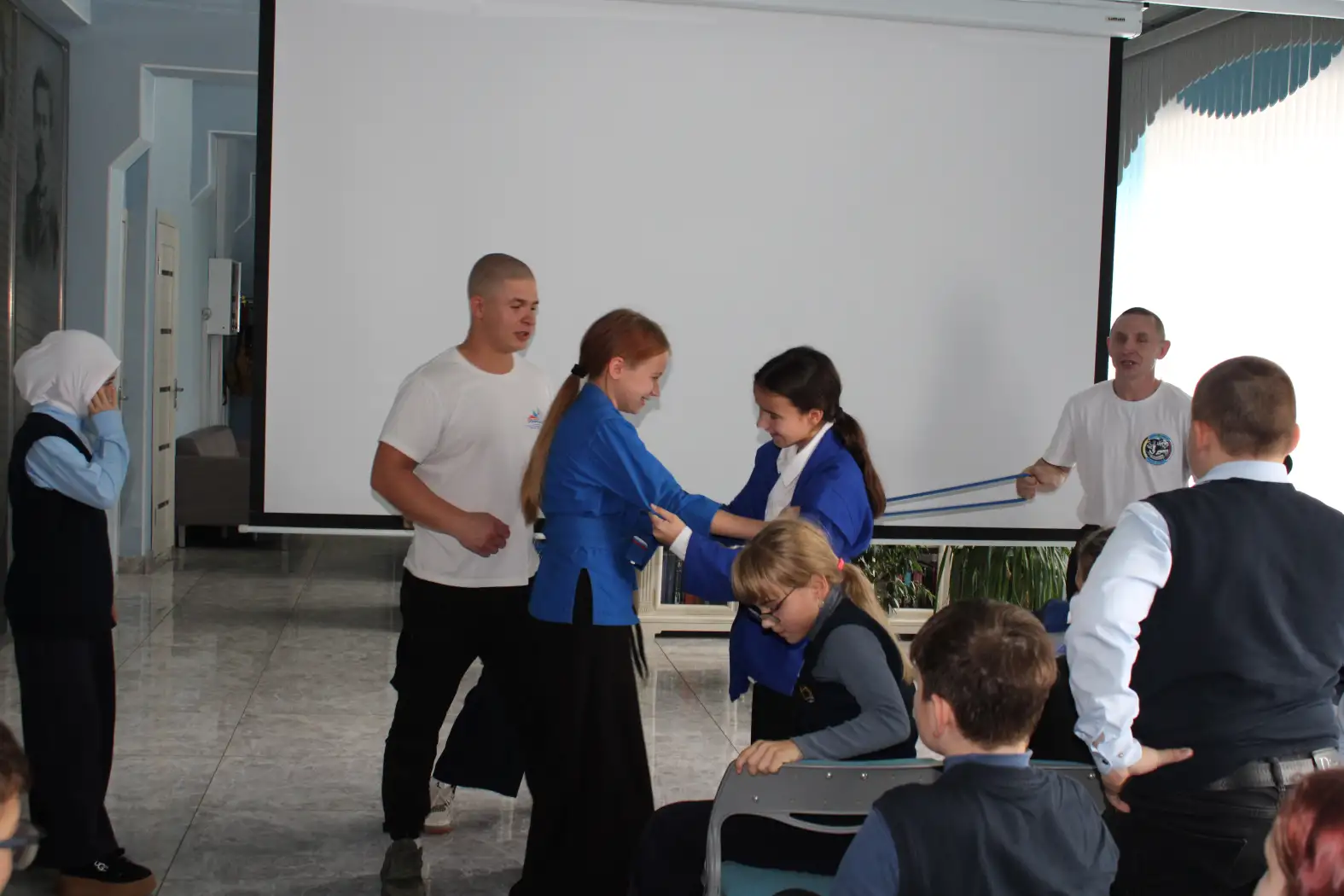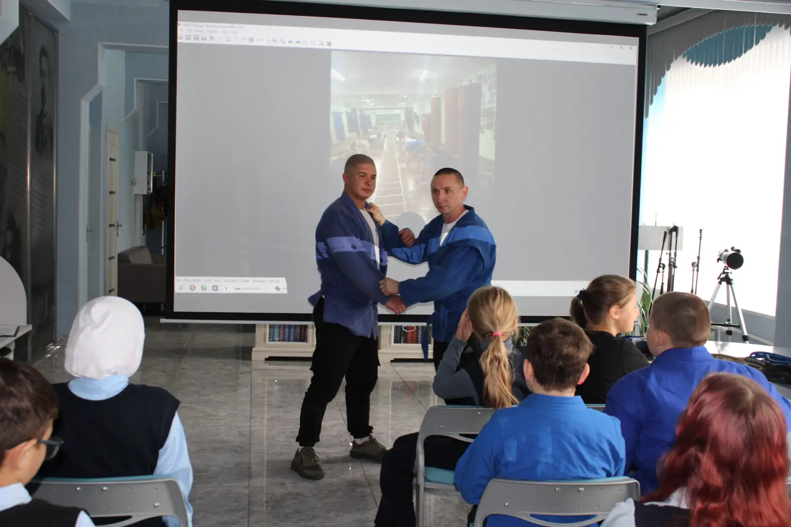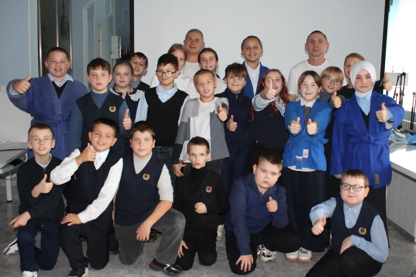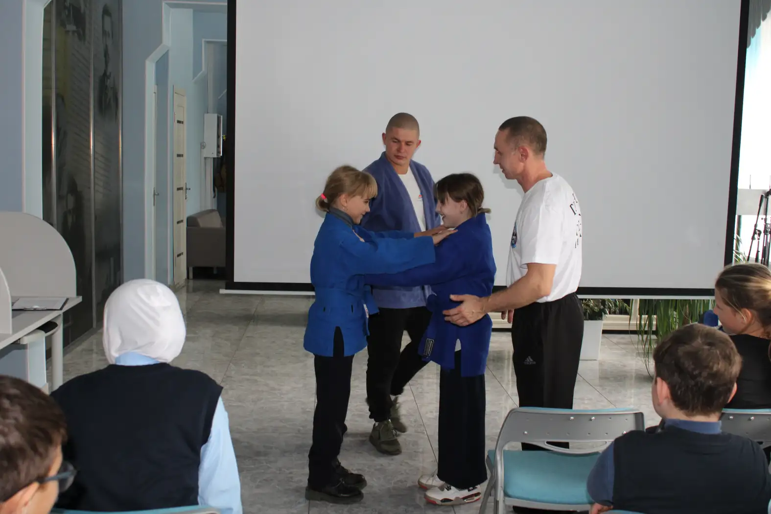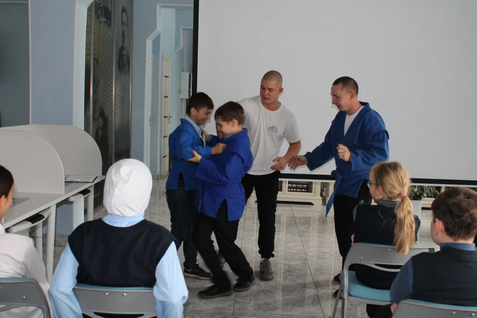 В течение мероприятия учащиеся второй школы послушали информацию о здоровом образе жизни, пробовали выполнять несколько упражнений, примеряли одежду самбиста «Кимоно» и задавали интересующие вопросы по теме.