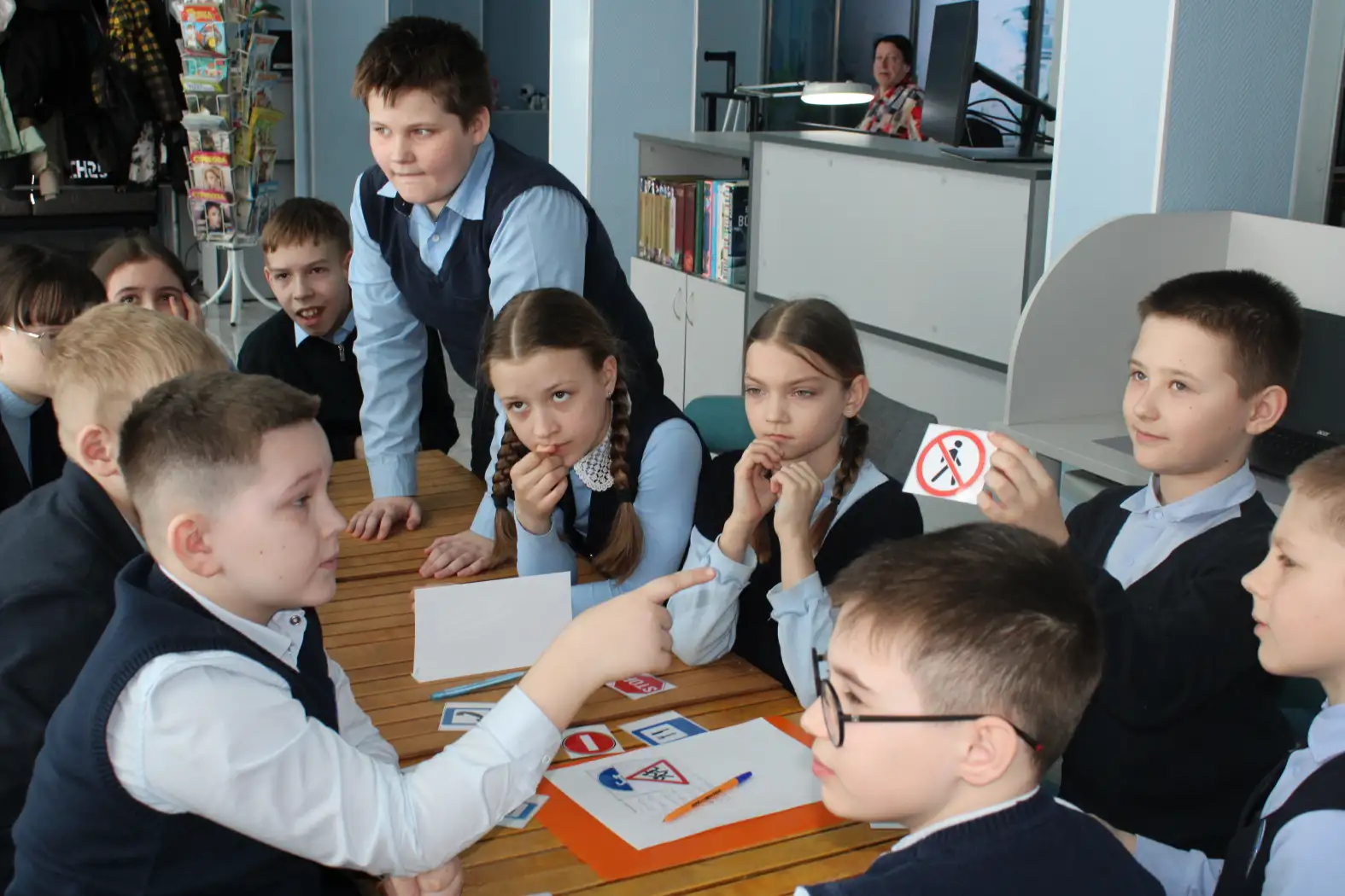 Учащиеся 4 класса школы №1, разделившись на две команды «Пассажиры» и «Пешеходы», активно выполняли различные задания инспектора, связанные с дорожными знаками – учились их понимать и запоминать.