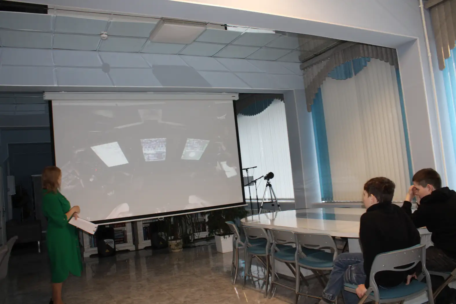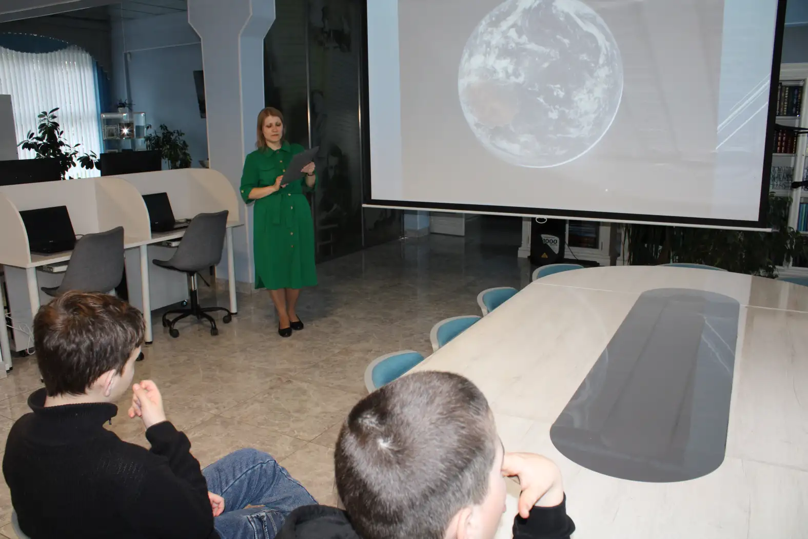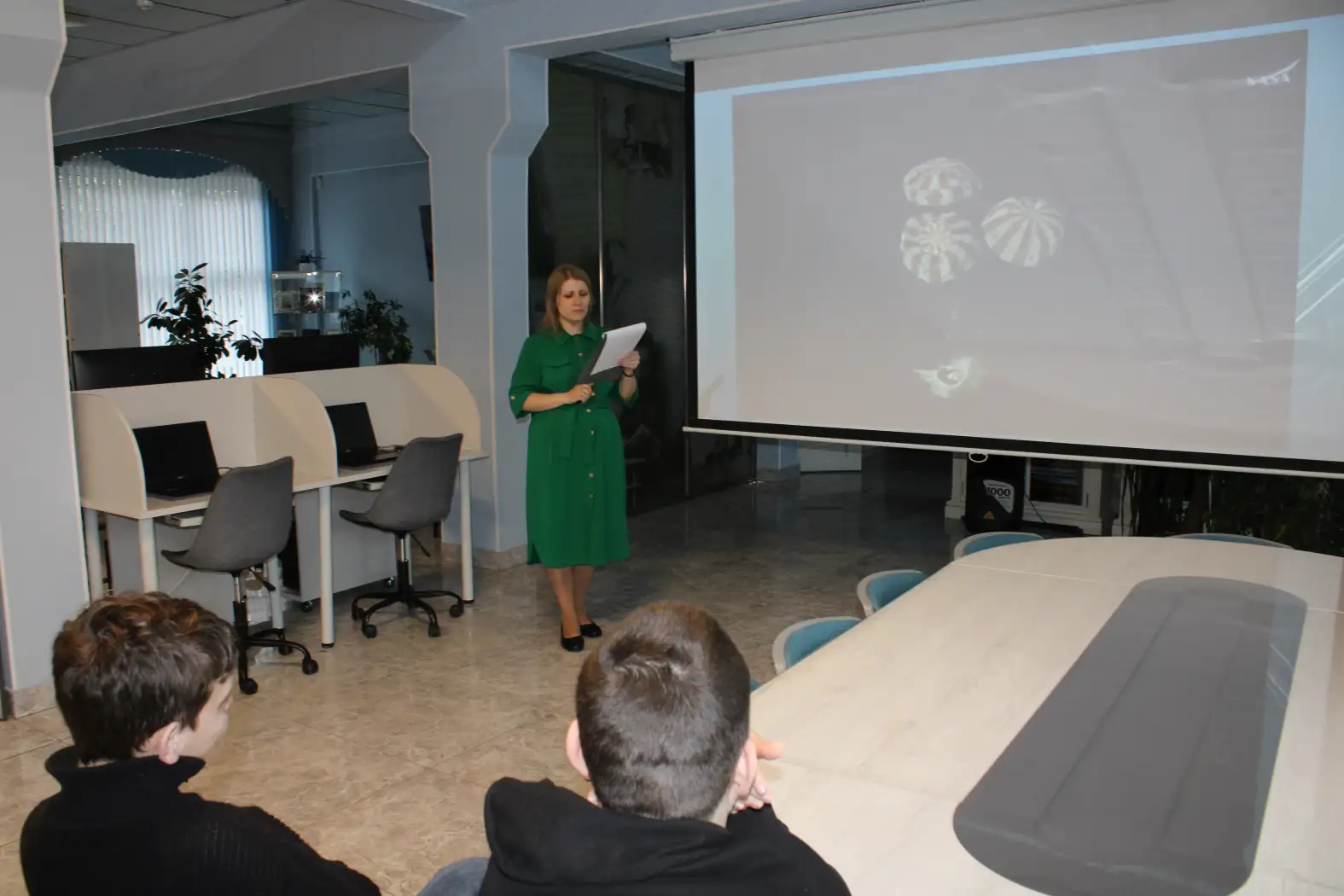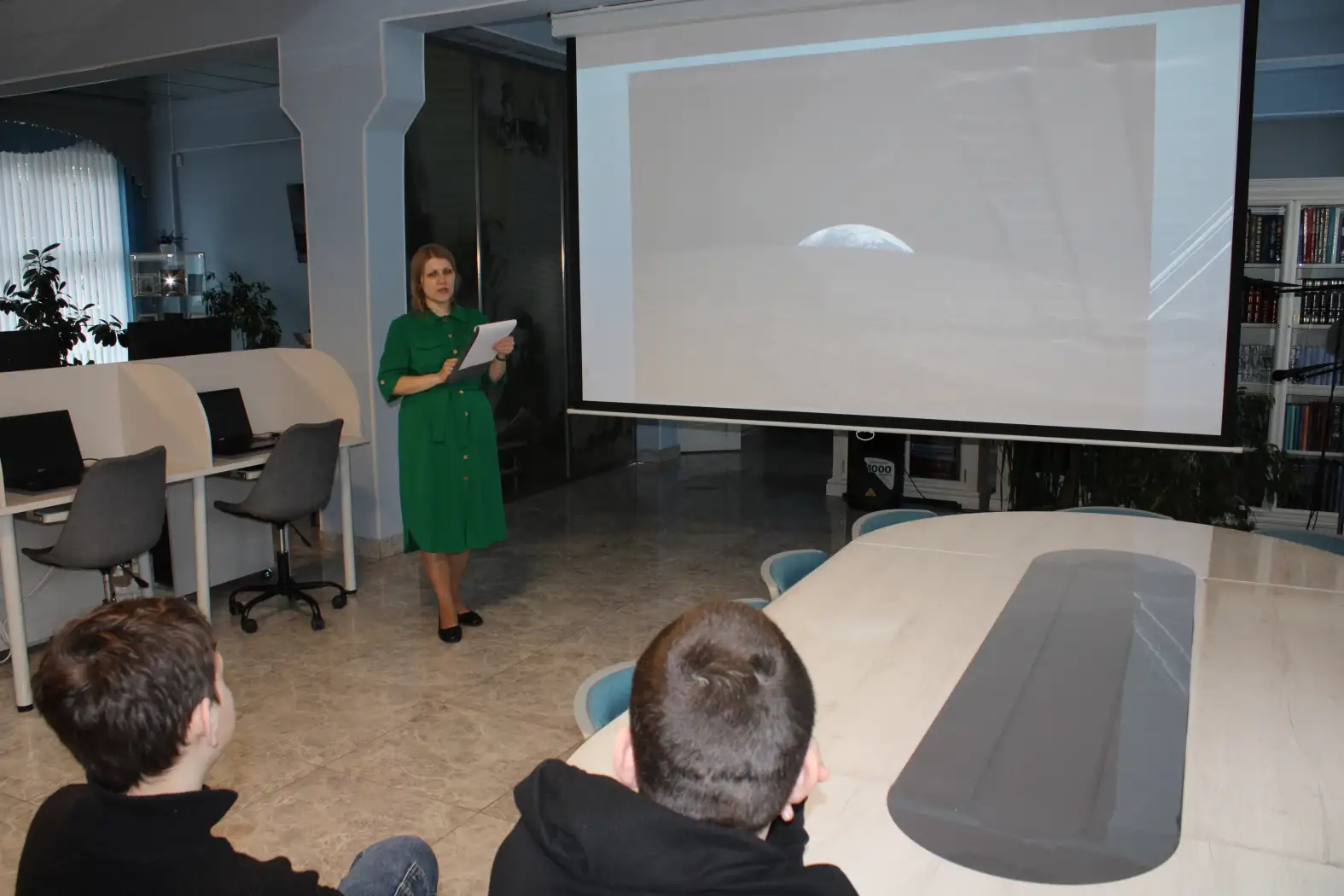 Встреча началась с обсуждения новости о недавнем полёте. Ребята с интересом слушали о том, что последняя подобная миссия была более 50 лет назад, в 1972 году. Сотрудники библиотеки, с помощью презентации, подробно разобрали этапы миссии «Артемида II»: старт с космодрома во Флориде, особенности траектории полёта, устройство корабля «Орион», условия жизни астронавтов, ключевые события миссии – выход за пределы околоземной орбиты, наблюдение солнечного затмения с орбиты Луны, потерю связи при заходе за Луну и успешное приводнение в Тихом океане.