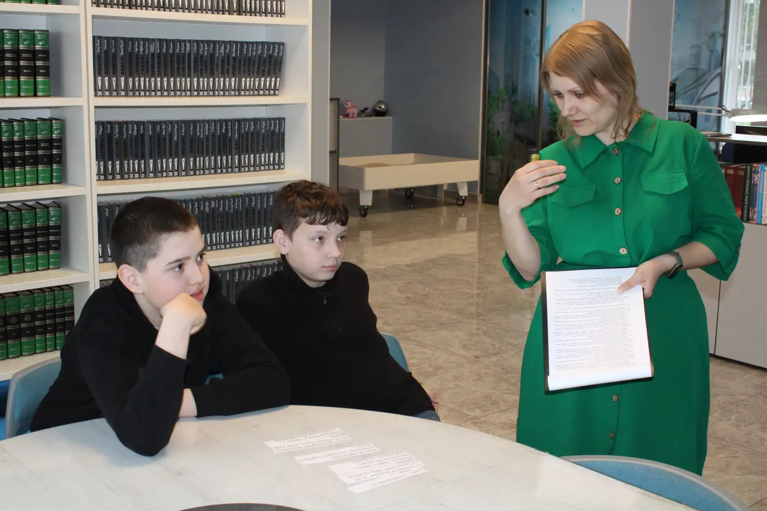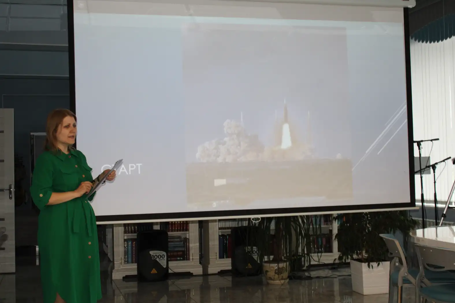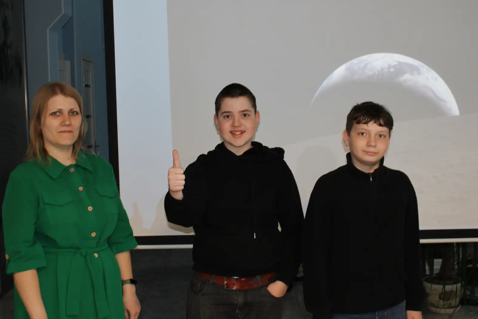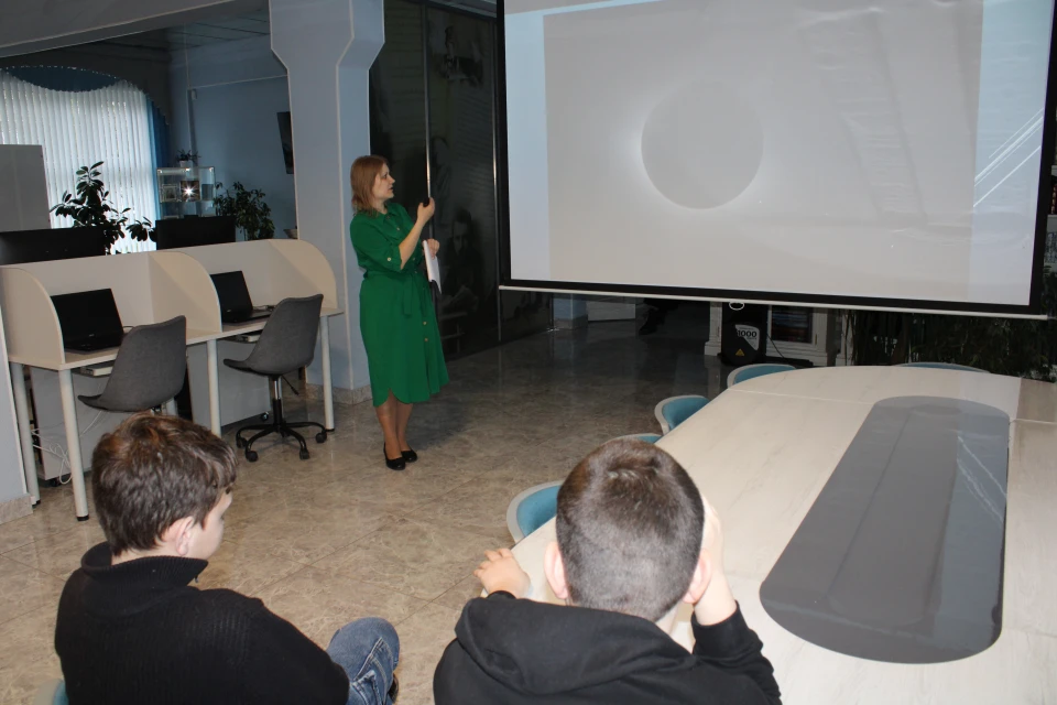 Встреча началась с обсуждения новости о недавнем полёте. Ребята с интересом слушали о том, что последняя подобная миссия была более 50 лет назад, в 1972 году. Сотрудники библиотеки, с помощью презентации, подробно разобрали этапы миссии «Артемида II»: старт с космодрома во Флориде, особенности траектории полёта, устройство корабля «Орион», условия жизни астронавтов, ключевые события миссии – выход за пределы околоземной орбиты, наблюдение солнечного затмения с орбиты Луны, потерю связи при заходе за Луну и успешное приводнение в Тихом океане.