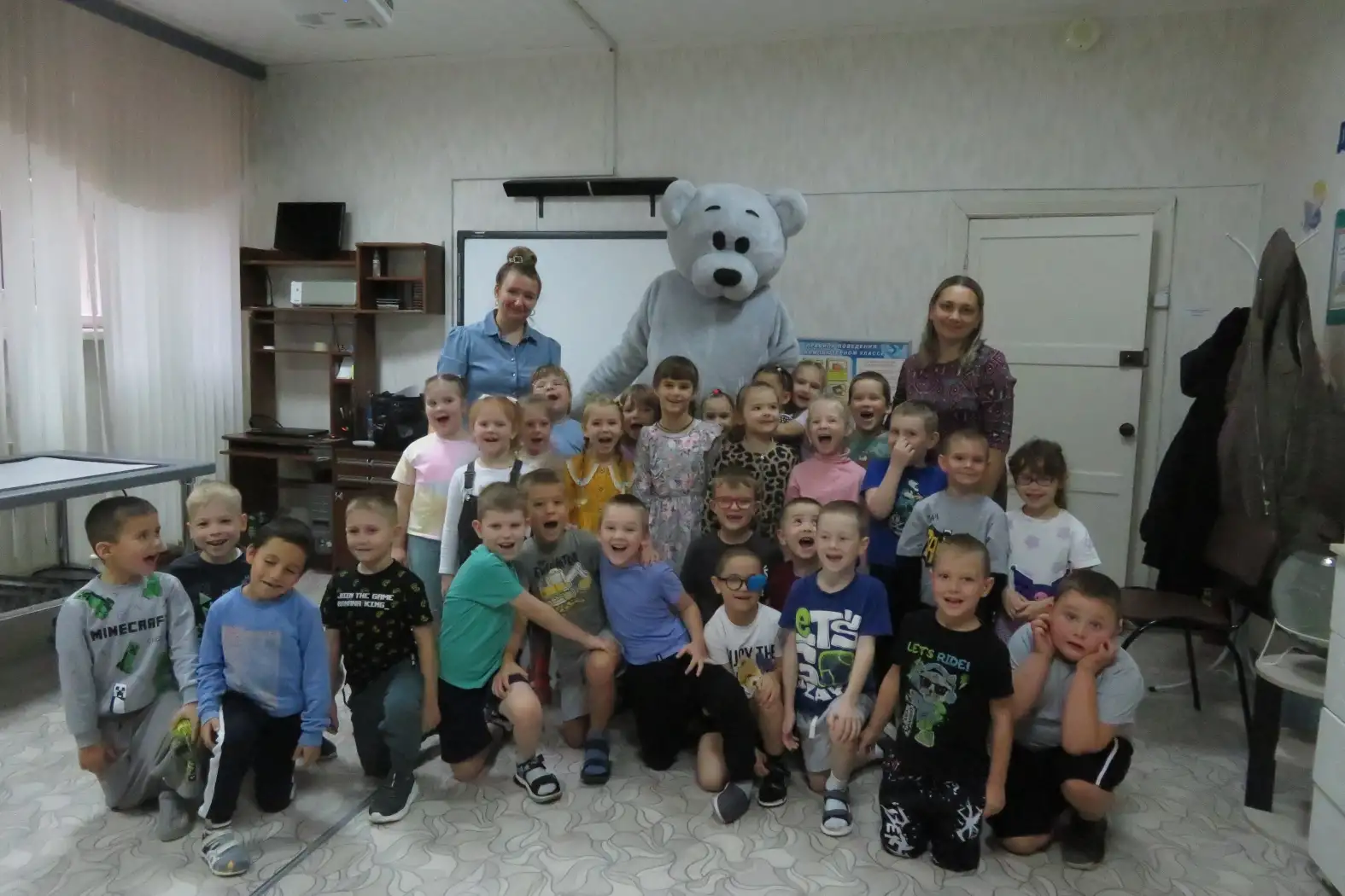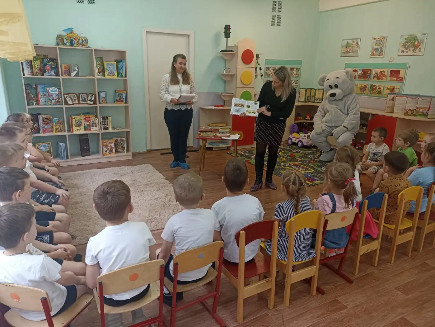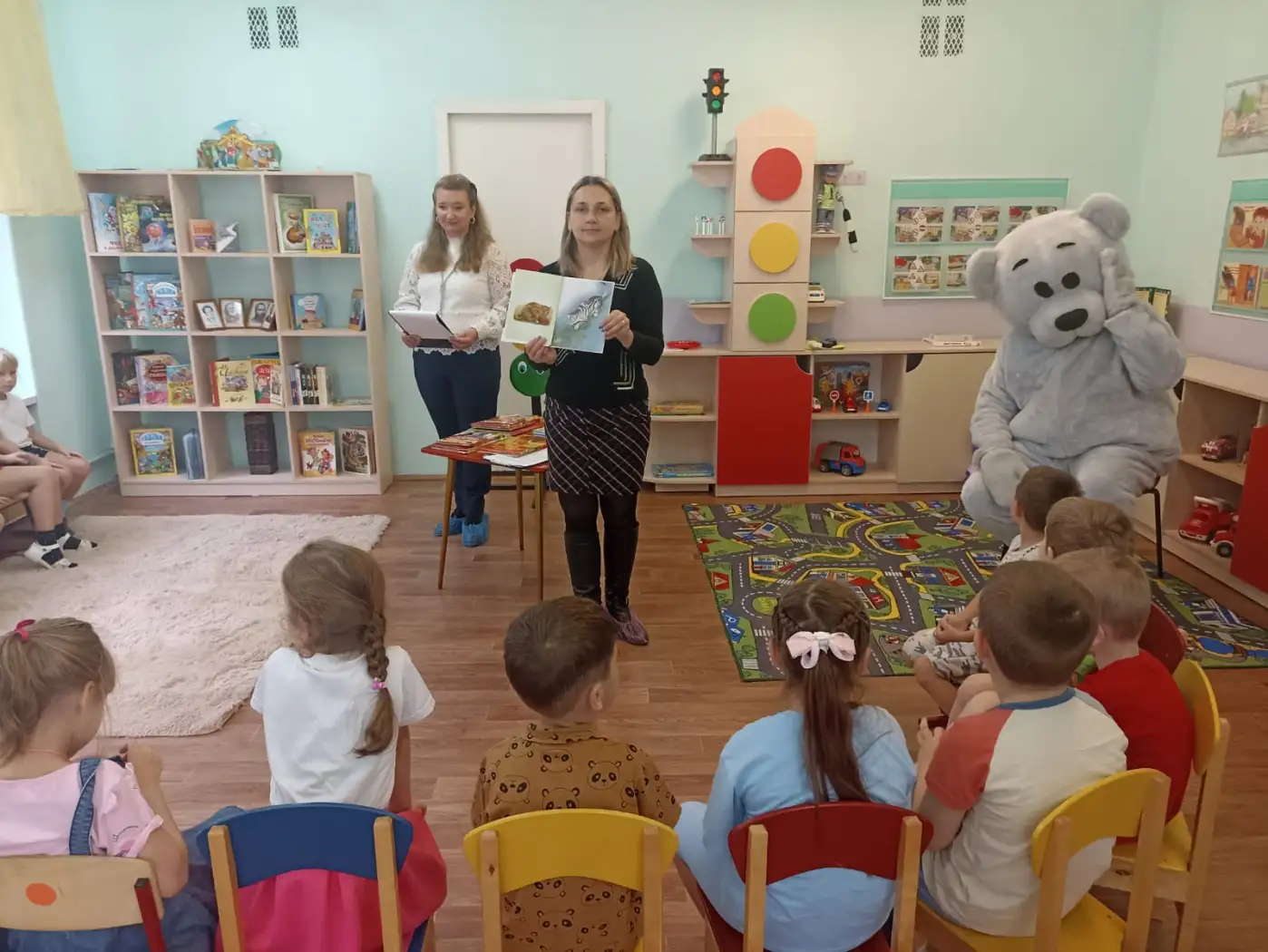 Особый интерес вызвала ростовая кукла «Медведь», которая совместно с работниками библиотеки, показала детям энциклопедии и роботов «Кошечку» и «Собачку»