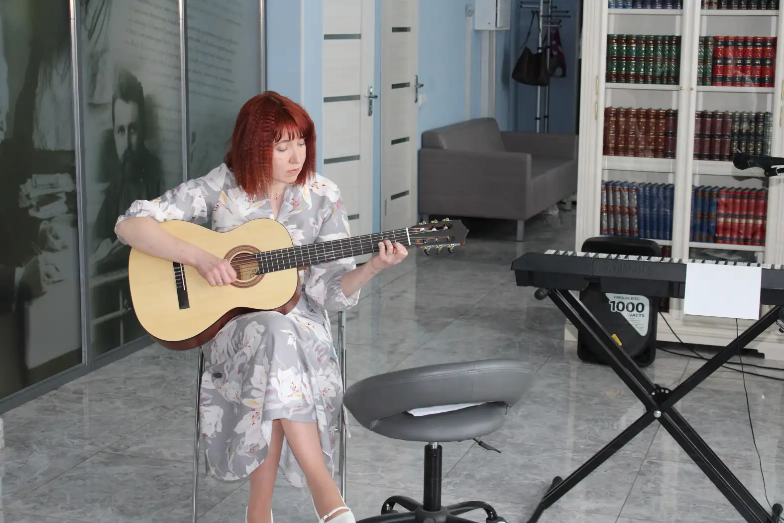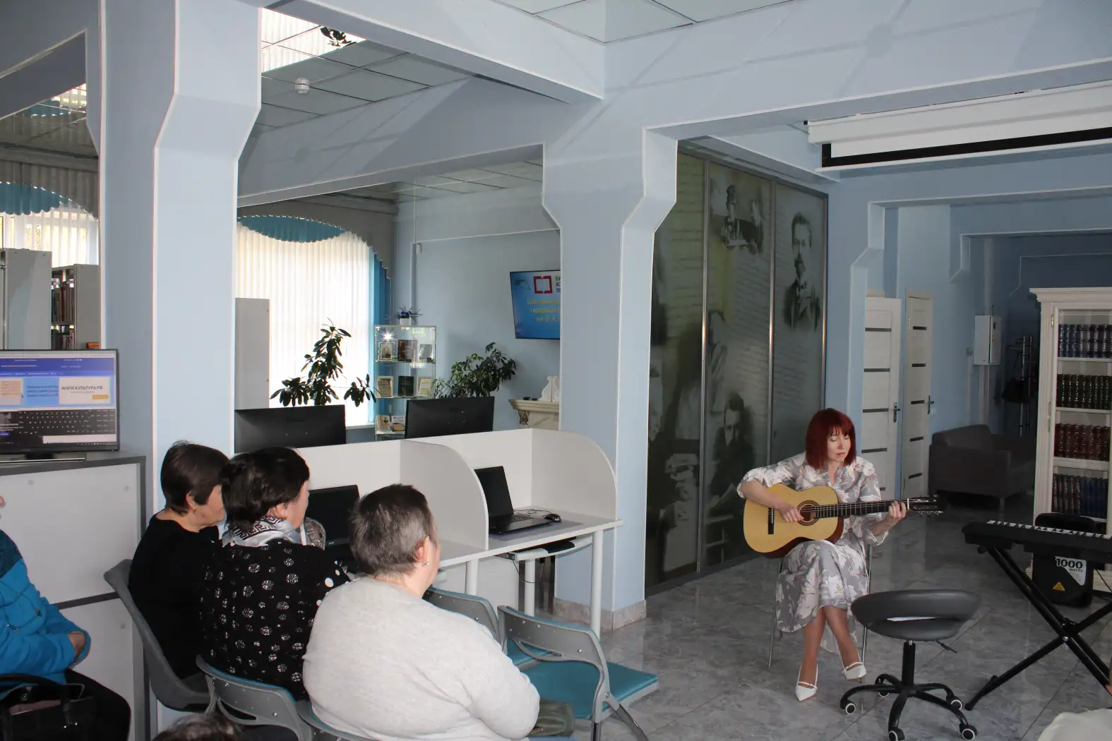 Анна Александровна не ограничилась лишь чтением своих стихотворений — она также исполнила их под аккомпанемент гитары и синтезатора, что добавило выступлению музыкальной глубины и эмоциональности. Зрители с большим интересом слушали её произведения, погружаясь в богатство образов и тонкость поэтического слова.